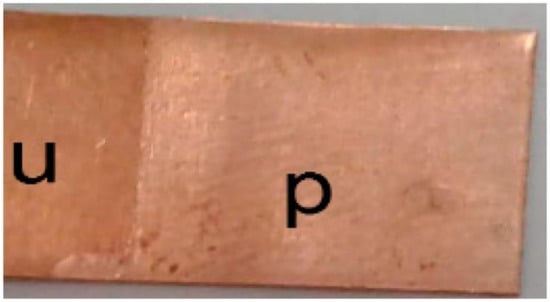 Photograph of the metal copper sheet before (u) and after (p) electropolishing in Ethaline at 0.18 V and 20 °C for 10 min (reprinted with permission from ref. []; Copyright 2019 by the authors, licensee MDPI).
