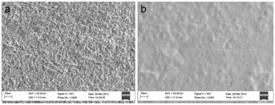 Electrochemical behavior of copper exhibiting various surface morphologies and compositions of oxide films was investigated gravimetrically under galvanostatic conditions in hydrophobic BmimNTf2 IL for natural surface oxidized, air-annealed, cathodically reduced, and cathodically deposited copper samples []. The air-annealed copper sheet with typical iridescences (Figure 7, bottom) exhibited a mirror-like surface after electropolishing in hydrophobic BmimNTf2 IL. Figure 8 shows SEM images of the rough surface of copper obtained by cathodic deposition from a CuSO4 water solution (Figure 8a) and after electropolishing in BmimNTf2 IL (Figure 8b).