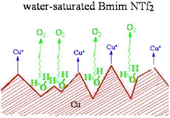 Electrochemical smoothing of copper asperities to obtain a mirror-like surface (Figure 7) was found to occur owing to Equation (10) in hydrophobic BmimNTf2 IL after removal of the surface oxides. It was found that the efficiency of copper polishing increased in water-saturated hydrophobic IL. This means that Equation (10) occurs primarily on the salient sites rather than on the recesses and pits of the copper surface (Figure 9), providing rapid and economic dissolution of the metal.