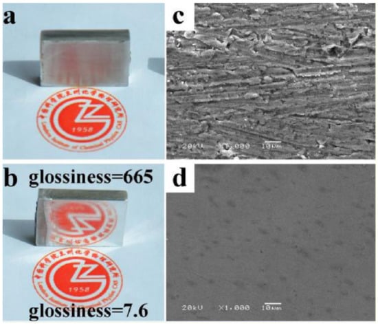Photographs (a,b) and SEM images (c,d) of the Al sample before (a,c) and after (b,d) electropolishing in an anhydrous aluminum chloride–trimethylamine hydrochloride mixture (reprinted with permission from ref. []; Copyright 2017 Elsevier).