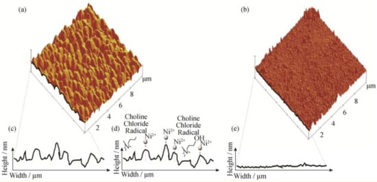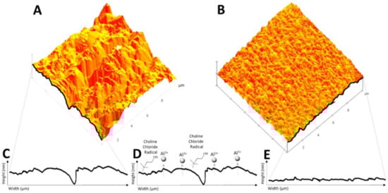 Electropolishing of Al was also studied in ethaline [,]. The surface of Al polished in ethaline demonstrated high optical reflectivity (4.5) []. Authors compared the results of electropolishing of aluminum in phosphoric acid and acid-free IL. It was established that Al roughness before and after electropolishing in ethaline decreased from 159.310 to 26.649 nm, respectively. The smoothing efficiencies were found to comprise about 83% in ethaline and 39% in 1 M phosphoric acid [,]. The authors claimed that optimal conditions for electropolishing of aluminum in ethaline were 2 V for 900 s.