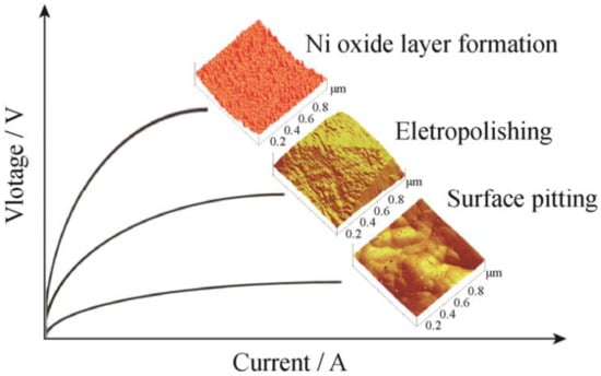 The probability of Equation (2) clearly decreases with the increase in the H+ migration rate to the cathode. The H+ migration rate depends on the viscosity of the electrolyte; the porosity, thickness, and chemical properties of the oxide film; as well as temperature, current density, voltage, and other factors [,,]. If the electropolishing occurs in acidic solutions, Equation (2) becomes the main process [,,,].