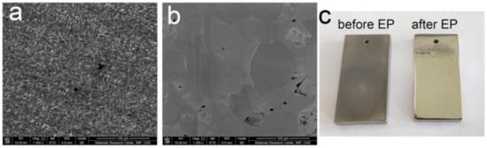 An average surface roughness of 5.7 nm was achieved after electropolishing at 6–10 V for 30 min (the initial sample had a roughness of 118.8 nm) [].