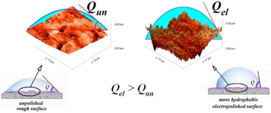 Schematic representation of the effect of the surface morphology of unpolished and electropolished surface of Ti-based alloy on liquid spreading (reprinted with permission from ref. []; Copyright 2021 Elsevier).