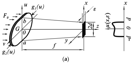 For the shaping of laser beams, different methods characterized by design variations in optical systems were developed [12,13,14]. However, not all potential material processing possibilities have been exhausted or realized. Therefore, in parallel with the development of laser techniques, the technology of beam shaping has also progressed. For cutting, marking, engraving, and drilling, simple objectives can sometimes be used; for example, single lens objectives, one objective with two or three spherical or parabolic lenses, or a single spherical mirror [15,16]. However, that is often not sufficient to focus a beam onto a predetermined area of the workpiece. Except for some particular cases, neither one of the existing optical systems for laser processing on zones of a predefined shape can provide a simultaneous combination of such functional capabilities as generating the required distribution of the power density and the concentration of all of the energy of the laser beam into the processing zone of a desired shape with high reliability. Figure 1a shows the geometry of the focusing of a laser beam with the complex amplitude F0 into a section |x| ≤ d in the focal plane z = f [17]. The aperture of the optical element G is restricted by the curves v = g1 (u) and v = g2 (u) and by sections of straight lines u = a and u = b. The function µ (x, ε) characterizing the distribution of energy in the ε-vicinity of the focusing section is introduced.