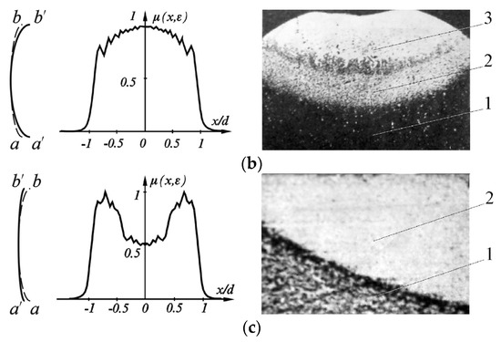 Geometry of the focusing of a laser beam (a) [17], schematic images of deviations a′b′ from the calculated surface ab as well as the function µ (x, ε) that characterize the distribution of energy [17] and resulting defects. Defects in the cross-sections of the heat-affected zones of steels during laser processing: an uneven processing depth along the width of the heat-affected zone of carbon tool steel (b) and local melts when processing alloy tool steel (c): 1—initial structure; 2—area of hardening without melting; 3—melting area [18].