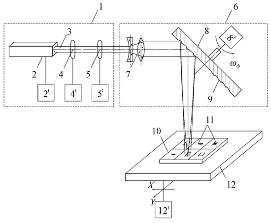Laser system for material processing [21]: 1—laser technological unit; 2—laser; 3—beam; 4 and 5—devices for measuring the spatial distribution of the power density and energy of the beam; 6—optical system; 7—telescopic system; 8—diffractive optical element (diffractive free-form optics); 9—functional surface of the diffractive optical element; 10—processable material; 11—processing area; 12—coordinate displacement device.