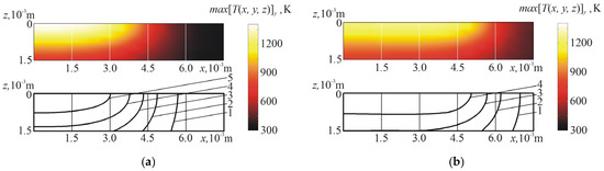 The calculation results of maximum temperature values max[T(x, y, z)]y across the width of the heat-affected zone of a rectangle-shaped heat source with power Q = 950 W moving at a constant linear velocity υ = 1.1 × 10−2 m/s on the surface of chrome–nickel–molybdenum steel before (a) and after adaption of the power density (b). Temperature T: (isothermal: 1—600 K; 2—750 K; 3—900 K; 4—1050 K; 5—1200 K) [65].