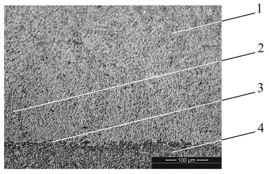 The structure of 40HNMA chrome–nickel–molybdenum steel in the cross section of the heat-affected zone: 1—hardened grain structure of a martensitic type; 2—area of incomplete hardening; 3—transition zone; 4—initial structure [65].