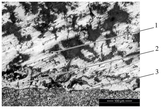 Structure of a sealing coating of aluminum–boron nitride (Al-BN), deposited on the sublayer of Ni–Al alloy after laser treatment: 1—coating; 2—sublayer; 3—substrate of the Ni-based superalloy [103].