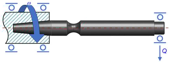 Principal scheme of cantilever-type rotating bending fatigue test experimental setup (rotation speed ω = 3000 rpm, a bending load range Q 800, 700, 600, 500, 400, 300 and 243 N).
