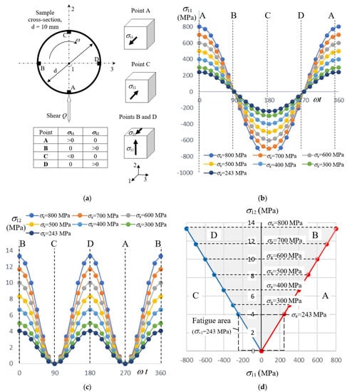 Theoretical representation of angle of revolutions ωt versus normal stress σ11 and shear stress σ12: (a) points A, B, C, D are presented at different locations as small volumetric elements where normal stresses σ11 and σ12 reach their extreme values, (b,c) points A, B, C, D are presented at different locations as small volumetric elements where stresses σ11 and σ12 reach their extreme values, (d) graphical dependencies of stresses σ11 and σ12, respectively, versus ωt for varying stress amplitudes σa d, complex distribution of stresses σ11 and σ12 according to their location and stress amplitude σa.