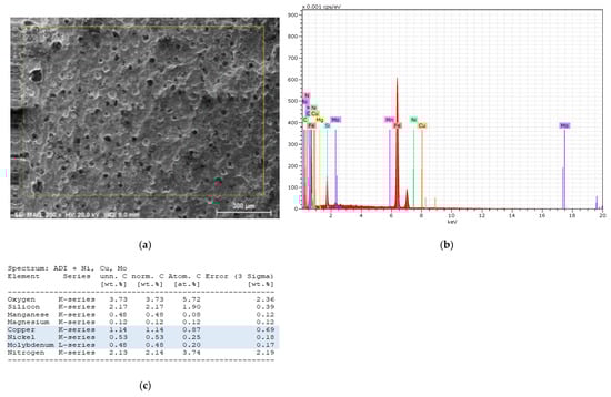 EDS analysis performed on the ductile cast iron modified with Ni, Cu, and Mo revealed a considerable amount of those elements (Figure 4).