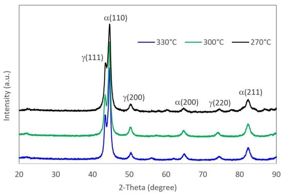 The composed phases in the samples were quantified by XRD diffraction pattern (Figure 6). The X-ray reflected microscopic analysis, showing the formation of a predominantly ausferrite structure. The planes of a face-centered cubic lattice (fcc) γ (111), γ (200), and γ (220), were identified in all samples with slightly different intensities. The formation of a body-centered phase (bcc) was presented by the existence of α (110), α (200), and α (211) planes [4,14]. The peaks of fcc and bcc were located close to each other, which indicates the formation of acicular ferrite in carbon-enriched austenite (ausferrite). The lower austempering temperature of 270 °C showed a higher intensity of the (111) plane, basically owing to the formation of high carbon-retained austenite. This can be attributed to the decrease in the nucleation potential of ferrite lamellar, due to the decrease in the cooling rate during quenching [32].