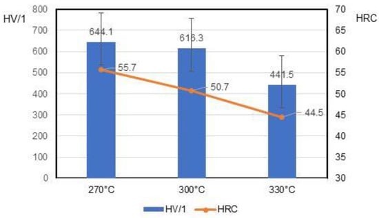 The Vickers hardness values HV/1 were registered on the longitudinal sections of the samples. The values of hardness are indicated in Figure 7. The austempering temperature affected the material hardness: the maximum values were achieved when the lowest austempering temperature of 270 °C was utilized. This could be explained by optimum content of ausferrite. As the austempering temperatures increased, the content of the retained austenite increased, but the amount of acicular ferrite gradually decreased. Both the retained austenite and the ferrite coarsening resulted in a decrease of the hardness [10,32], while the volume fraction of high-carbon austenite increased gradually as did the carbon content [33] because a part of the carbide dissolved into the matrix.