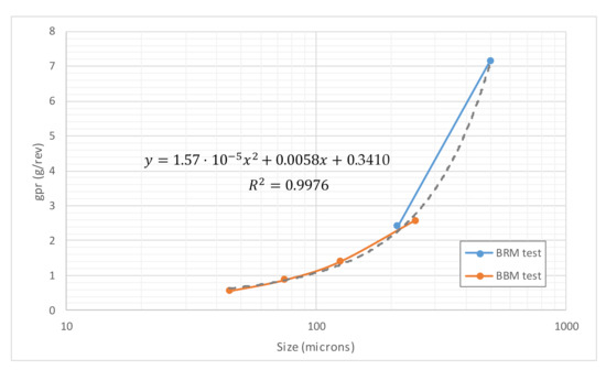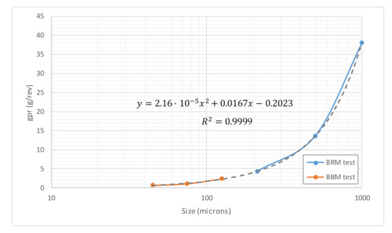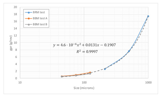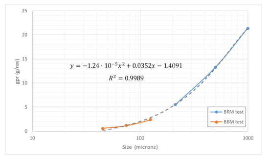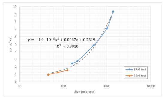 Finally, Barruecopardo ore samples results are depicted in Figure 10 and Figure 11. As mentioned above, BBM tests were performed on the same ore samples but with different origins, while BRM tests were performed on the composite obtained after blending both samples. Once more, with an evident lack of continuity in the wi versus P100 plot (Figure 10), a clear quadratic trend was obtained when plotting gpr values versus P100 (Figure 11), with a very high value of the determination coefficient, 99.95%.