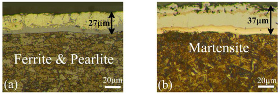 Metallographic sections of the coated steels were catered before and after quenching in order to measure the thickness of the coating and to determine the microstructure of the material. Figure 1 illustrates the substructure and formed changes in the thickness of the Al-Si coating before and after the hot-stamping operation. The microstructure of the raw material is a combination of ferrite and pearlite, which was converted into a martensite microstructure after hot-stamping. On the other hand, after hot-stamping, the Al-Si coating diffused to the base metal, transformed into an alloyed intermetallic layer, and the average thickness of the layer increased from 27 μm to 37 μm. This coating layer structure consists of Al-Fe-Si and different intermetallic compounds of α-Fe with Al and Si in a solid solution (e.g., FeAl2 and Fe2SiAl2) [9,22,23].