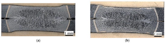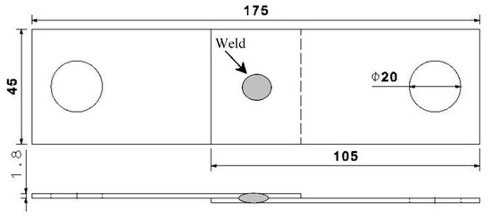 In order to determine the effects of Al-Si coating on the static strength of welded joints, the tensile shear test was performed. According to ISO 14273, the coated and uncoated steels were cut into 105 mm × 30 mm pieces for preparing static tensile shear specimens [24]. The dimensions and overlap are shown in Figure 2. The initial free span between the clamps was 95 mm.