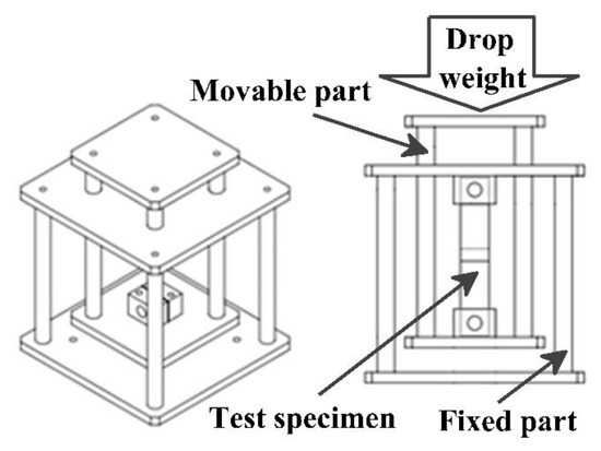 To carry out the impact test on the specimens using the drop test system, a fixture shown in Figure 5 was designed and fabricated. This fixture consisted of a fixed and a moving part. The test specimens were locked between these parts. After releasing the dropped weight, it stroked the moving part and a force was exerted on the specimens.