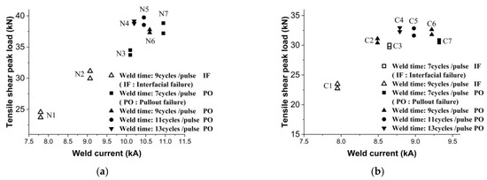 The purpose of this study was to determine the suitable welding parameters required to achieve the highest tensile load capability of the welded joints. Hence, because of selecting most of the welding parameters near the expulsion condition, the number of specimens was limited and redundant tests were avoided. For both types of materials, seven tensile shear strength specimens with at least two repetitions were prepared by applying different combinations of welding current and time. The welding parameters are shown in Table 2. Among these seven selected welding parameters, four combinations were near the expulsion condition for achieving the maximum tensile shear failure load and the other three were relatively far from this condition to allow studying the effects of welding parameters on tensile shear peak load. The effects of welding current and time on the tensile shear failure load of welded joints for both types of steel were determined. The data are represented in Figure 7.