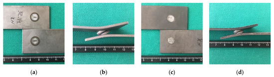 - Zhang, H.; Qiu, X.; Xing, F.; Bai, J.; Chen, J. Failure analysis of dissimilar thickness resistance spot welded joints in dual-phase steels during tensile shear test. Mater. Des. 2014, 55, 366–372. [Google Scholar] [CrossRef]