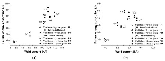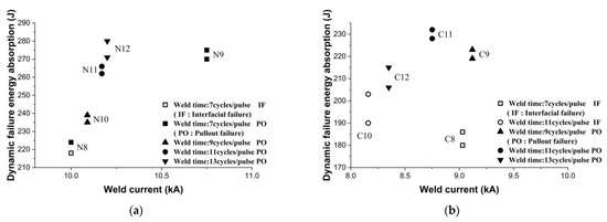 For both types of sheets, five impact test specimens with at least two repetitions were prepared by applying different combinations of welding current and time near the expulsion condition for achieving the highest impact failure load. Impact tests were conducted on these specimens. The welding parameters are shown in Table 3. The effects of the welding parameters on the dynamic failure energy absorption of the welded joints for both types of materials are shown in Figure 11.