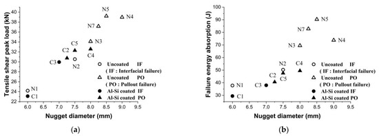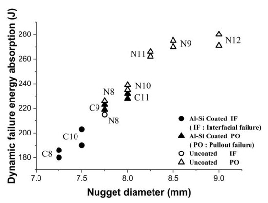 In general, weld nugget diameter is regarded as a criterion for the quality and strength of spot-welded joints. The effect of weld nugget diameter on the tensile failure load and energy absorption of the specimens is shown in Figure 10. It was observed that for the uncoated specimens with increasing nugget diameters of up to 8.5 mm, the tensile failure force and energy absorption increased and then, despite increasing nugget diameter, decreased. For the Al-Si coated specimens, by increasing weld nugget diameter the tensile failure and energy absorption increased.