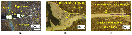 During the spot welding of hot-stamped Al-Si coated steels, the coating tends to melt due to the high temperature at the faying interface, and a large portion of the molten coating is displaced from under the electrodes and gathers around the weld nugget edges. Some portions of the coating remain on the molten and solidified area and create Al-Fe intermetallic phases. The presence of brittle Al-Fe phases in the weld nuggets causes a decrease in their strength. Figure 14a shows an optical image of the area around the welded zone. Figure 14b,c shows enlarged images of region “b” and “c”, respectively. Because of aggregation of the molten Al-Si coating after weld solidification, the boundary of the weld nugget near the faying surfaces is weakly bonded. In addition, the presence of a notch creates a crack in the edge of the weld nugget, which is due to the concentration of stress in this area. The existence of molten Al-Si around the fusion zone may penetrate cracks through the fragile bonded area and spread along the fusion zone. Hence, in the case of Al-Si coated steel (compared to uncoated steel) the presence of brittle Al-Fe phases in the weld nuggets decreases the mechanical properties of the welded joints and causes a decrease in the maximum tensile failure load and energy absorption in both static and impact tests. Additionally, it increases the risk of changing failure mode from PO to IF fracture in these tests.