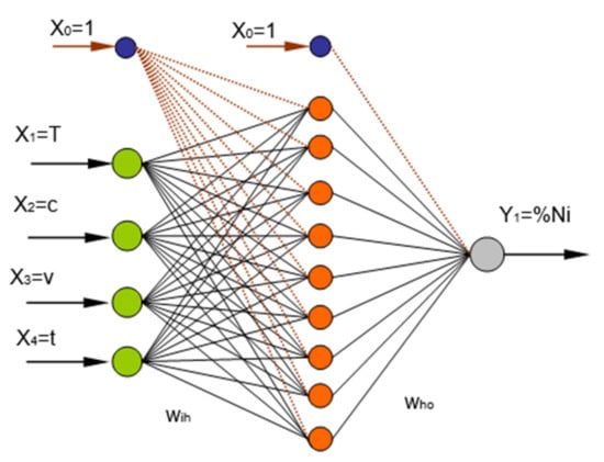 Optimization of UO using artificial neural network and regression analysis is a new challenge in order to establish optimal parameters for the maximal leaching efficiency. Especially, due to the complex chemical composition of lateritic ores, as well as the need for decreased production costs and increased of nickel extraction in the existing resources, computer modeling of nickel ore leaching process has seen increased demand. Milivojevic et al. [40] applied the design of experiments (DOE) theory determining the optimal experimental design plan matrix based on the D optimality criterion. In the high-pressure sulfuric acid leaching (HPSAL) process for nickel laterite in “Rudjinci” ore in Serbia, the temperature (T), sulfuric acid to ore ratio (c), stirring speed (v), and leaching time (t) as the predictor variables (Xo, X1, X2, X3, X4) and the degree of nickel extraction as the response have been considered, as shown at Figure 2.