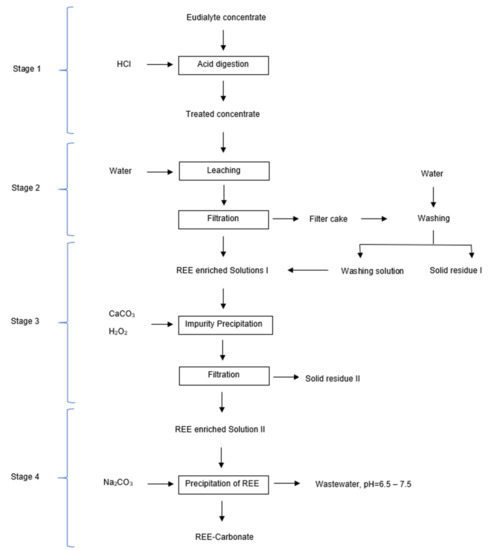In contrast to previous work, Ma et al. [66] developed one environmentally friendly hydrometallurgical treatment of eudialyte in laboratory and scale up conditions using acid digestion with hydrochloric acid at room temperature, water leaching, and precipitation of impurities with calcium carbonate, as shown at Figure 4.