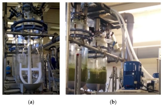 (a) Acid digestion reactor and (b) system of two digestion reactor during operations (key elements: anchor stirrer, glass reactor (40 L), engine, an injected tube for a transport of suspension supported by a double membrane pump).