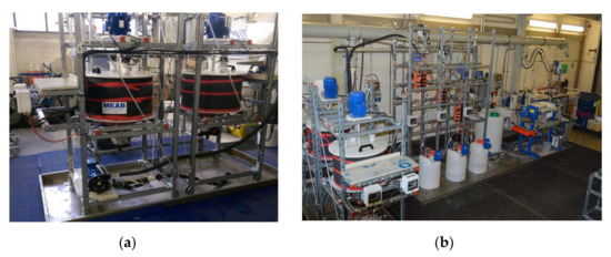 (a) Two reactors for leaching (2 × 100 L), (b) System for leaching, neutralization, and filtration. Main components: neutralization unit (3 reactors × 10 L and 1 × 8.5 L), stirred collecting tank (250 L) and separation unit (chamber filter press).