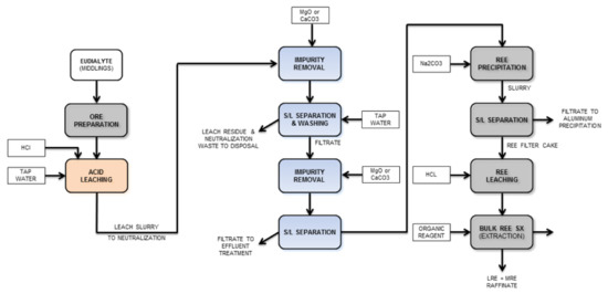 As shown at Figure 8, the solvent extraction (“SX”) is applied for the enrichment of REE in poor solutions and the separation and refinement of metals. This is achieved by mixing an aqueous phase with an organic phase. The driving force of the extraction process is the different metals concentration between the aqueous and the organic solution. In contrast to eudialyte, other REE- minerals such as monazite [69], steenstrupine [70], xenotime [71], and bastnasite [72,73,74,75] contain radioactive elements such as thorium and uranium. Therefore, an initial treatment is needed, as shown for bastnasite in Figure 9.