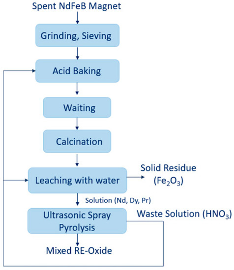 Kaya et al. [87] offered new process for treatment of spent NdFeB magnets without solvent extraction. Spherical particles of REE-oxides were produced from spent NdFeB magnets using a combined process containing following operations: nitric acid baking process at 200 °C, calcination, water leaching and ultrasonic spray pyrolysis between 700 °C and 1000 °C, as shown at Figure 10.