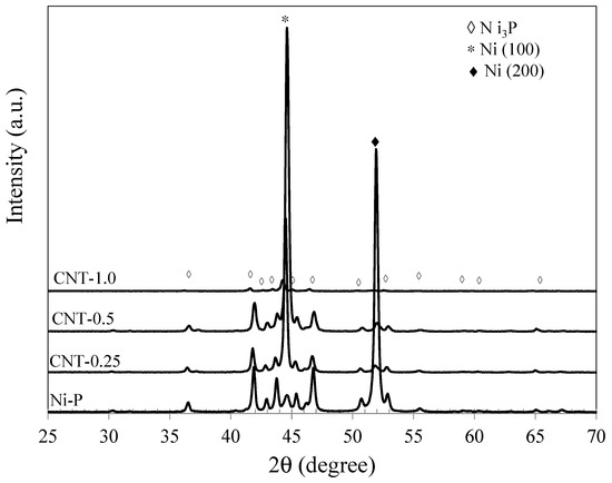 XRD patterns of the Ni–P and Ni–P/MWCNT composite coatings are shown in Figure 1.