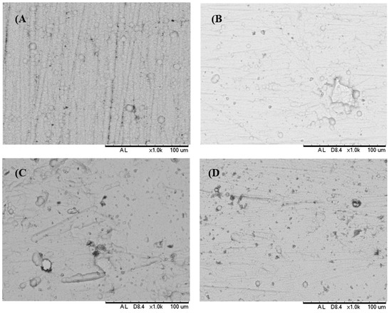 The binary Ni–P film displays a typical nodular morphology (Figure 2A). The nodular structure is associated with nucleation and growth of the deposit during electroless plating. A high nucleation rate is reported to enhance the number of nodules during deposition [42]. By adding the CNT filler into the plating, the nodules size became finer. The nodular morphology is less clearly perceived for CNT-0.25 (Figure 2B) due to their small size; this effect is enhanced for the coatings obtained in the baths with higher CNT loadings (Figure 2C,D). In this respect, the CNT particles tend to increase the nucleation rate during electroless deposition, as previously observed by Xu et al. [39]. As a consequence, the coating surface assumes a more compact character which, in turn, can affect the corrosion resistance in a positive way.