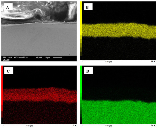EDS mapping of the cross-sections for CNT-0.25: (A) SEM micrograph; (B) Ni; (C) P; (D) Fe.