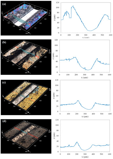 3D views of the scratched region and the corresponding transverse profile along the lines marked in the micrographs: (a) Ni–P; (b) CNT-0.25; (c) CNT-0.5; (d) CNT-1.0.