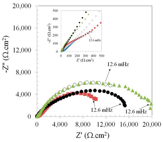EIS results are represented as Nyquist plots, as shown in Figure 5. All samples are characterized by capacitive loops in the medium to low frequencies, whose diameter depends on the MWCNT loading in the coating. As pointed out in the literature, the corrosion resistance is associated with the diameter of the Nyquist plots, since it is associated with the polarization resistance of the electrode [45,46]. The uncoated substrate presented very low impedance values when compared to the coated samples. As a consequence, its Nyquist plot is only seen when the impedance scales are expanded, as shown in the inset of Figure 5. The impedance values were greatly enhanced for the coated samples, indicating its beneficial effect on the corrosion resistance of the steel substrate.