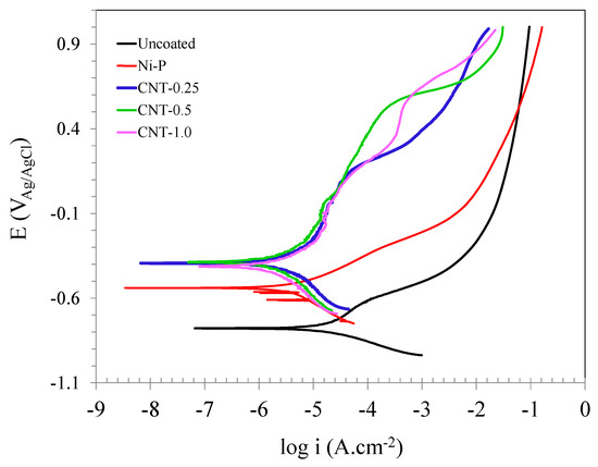 The corrosion resistance of the Ni–P and Ni–P/MWCNT coated samples was further evaluated by potentiodynamic polarization tests after 1 h of immersion in 3.5 wt.% NaCl solution at room temperature. The results are shown in Figure 6. The uncoated API 5L X80 steel substrate was also tested for comparison purposes. The corrosion potential (Ecorr) and corrosion current densities (icorr) were determined from these curves by means of the Tafel extrapolation method. The results are displayed in Table 3, along with the protection efficiency (P%) of the different coatings, as calculated from Equation (2).