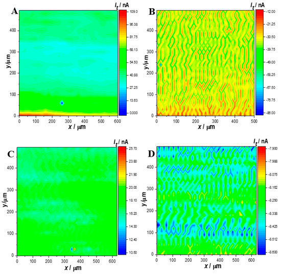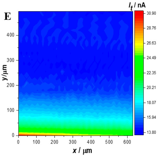 Izquierdo et al. [50] reported that the cathodic currents can be due to the fact that once the concentration of Fe2+ ions is low at the metallic surface, these species are likely to be easily oxidized to Fe3+ before diffusing to the bulk electrolyte. The cathodic current would then be probed at regions where Fe3+ ions are formed according to reaction (1). The presence of such regions would indicate that the film, although presenting low electrochemical activity, is prone to corrosion at its defective sites. It is possible to see in the SECM map shown in Figure 7B that the current values vary throughout the surface, suggesting that it is not homogeneous with respect to the sites where Fe2+ oxidation occurs.