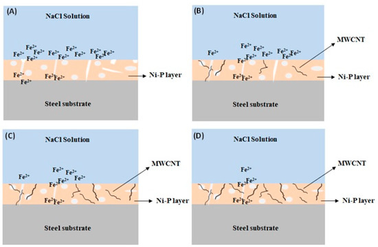 Schematic illustration of the corrosion mechanism of the Ni–P and Ni–P/MWCNT coatings: (A) Ni–P layer; (B) CNT-0.25; (C) CNT-0.50; (D) CNT-1.0.