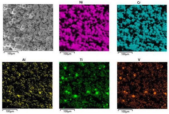 SEM image and EDS maps of the mixed powder composed of 99 wt.% IN625 and 1 wt.% Ti6Al4V.