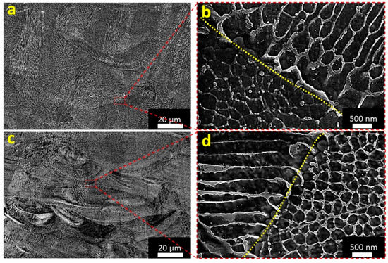 SEM images of the AB IN625 (a,b) and AB IN625mod (c,d), showing the fine dendritic structures. The yellow line indicated the melt pool contours for the high magnification images.