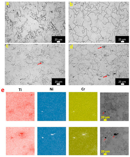 LOM images of the ST IN625 (a), STA IN625 (b), ST IN625mod (c), and STA IN625mod (d). Presence of residual Ti segregations (pointed by the red arrows). EDS maps of the STA IN625mod (e) showing the zones with Ti segregations with near-circular shape.