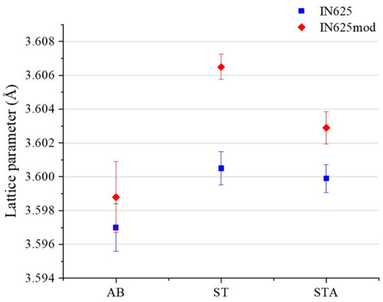 Figure 7 displays the lattice parameter evolution of the austenitic phase for the two materials in the as-built and heat-treated conditions. Additionally, the XRD patterns of the peak (111) of the IN625 and IN625mod versions in the different conditions are given in Figure A3.