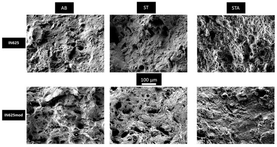 SEM images of the fracture surfaces of the IN625 and IN625mod in the different conditions.