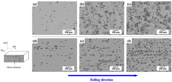 The microstructures of B4C/Al6061 composites are shown in Figure 1. In the case of the B4C/Al6061 composites fabricated by stir casting, most of the B4C particles were relatively well dispersed in the Al6061 matrix, as shown in Figure 1a–c. When the B4C/Al6061 composites were manufactured by stir casting, the B4C particles were randomly arranged in three dimensions. Some B4C particles (irregular shape) appeared like small particles because parts of them were exposed in the 2D SEM image. Figure 1d–f shows cross-sectional SEM images of hot-rolled B4C/Al6061 composites. After hot rolling, the B4C reinforcement in the Al6061 matrix was arranged according to the rolling direction. This phenomenon is more clearly observed with increasing B4C content (Figure 1f).