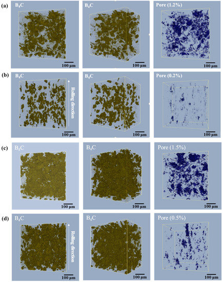 Figure 2 shows 3D images of 5 and 20 vol.% B4C/Al6061 composites analyzed by a 3D X-ray tomography microscope. Like the 2D SEM image, it can be seen that three-dimensionally arranged B4C particles are observed in the stir-cast B4C/Al6061 composites (Figure 2a,c). In the case of the 20 vol.% B4C composite, change in B4C dispersion after hot rolling was not observed well due to highly concentrated B4C particles (Figure 2d). However, it was clearly observed in the 5 vol.% composite after hot rolling. After hot rolling of the stir-cast B4C/Al6061 composites, B4C particles were arranged according to the rolling direction as shown in Figure 2b. Partially agglomerated B4C particles of the stir-cast B4C/Al6061 composites were rarely observed in the 3D image of the hot-rolled B4C/Al6061 composite. In addition, it was confirmed that pores generated in the stir casting process decreased after hot rolling.