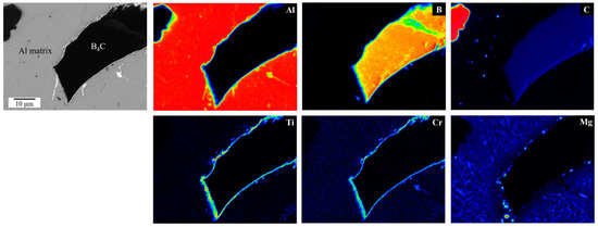 EPMA was used to analyze the elemental distribution of B4C/Al6061 composites. Figure 3 shows EPMA mapping images of the 5 vol.% B4C/Al6061 composite fabricated by the stir casting process. Since it was manufactured by the casting process, defects were not observed at the B4C/Al interface. In the EPMA element mapping images, large amounts of the boron (B) and carbon (C) elements can be observed in the B4C areas, which indicates that the crystal structure of the B4C particles was maintained in molten Al during the stir-casting process. Elemental titanium (Ti) and chromium (Cr) appeared continuously along the interface between the B4C and Al matrix. It is known that AlB2 and Al3BC precipitates form in the B4C/Al system [21]. However, these did not appear in the B4C/Al6061 composite manufactured by the stir casting process due to the Ti and Cr in the Al6061 alloy. Previous research has revealed the formation of multi-interfacial layers of Al4C3/(Ti,Cr)B2 in the B4C/Al6061 composites [20]. The formation of interfacial layers can limit the decomposition of B4C reinforcements and promote their wettability in liquid Al in the stir casting process. There was no interfacial debonding between the Al matrix and B4C reinforcement. Therefore, B4C/Al6061 composites fabricated by stir casting followed by the hot rolling process have well-aligned B4C distribution along the rolling direction, with a continuous interfacial layer between B4C and the Al matrix.